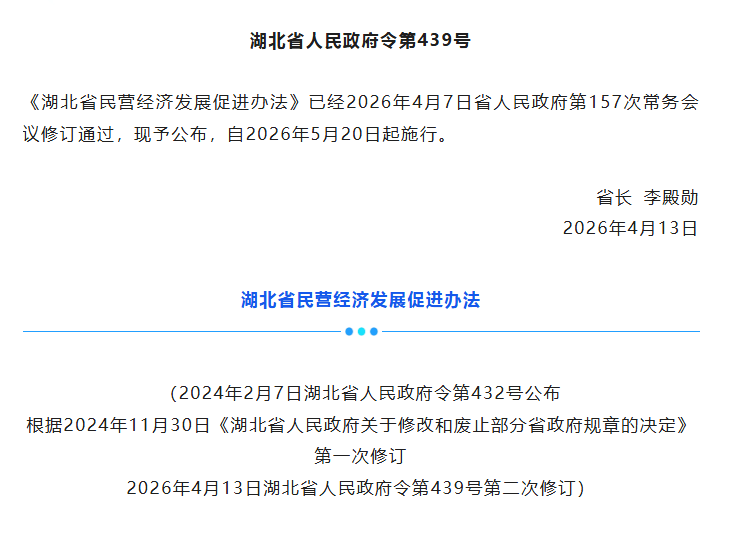 2026年4月13日,湖北省人民政府令第439号正式公布,历经两次修订的《湖北省民营经济发展促进办法》(以下简称《办法》)将于5月20日起施行。这部以国家《民营经济促进法》为遵循、立足湖北民营经济发展实际的省级规章,以9章56条的完整体系,从公平竞争、要素支持、投资融资、创新发展、权益保护等核心维度,构建起全周期、全链条、全方位的民营经济发展促进制度框架,既是湖北落实 “两个毫不动摇” 的法治宣言,更是推动民营经济从 “数量增长” 向 “质量跃升”、从 “政策护航” 向 “制度保障” 跨越的关键举措,为湖北加快建成中部地区崛起重要战略支点注入持久动力。