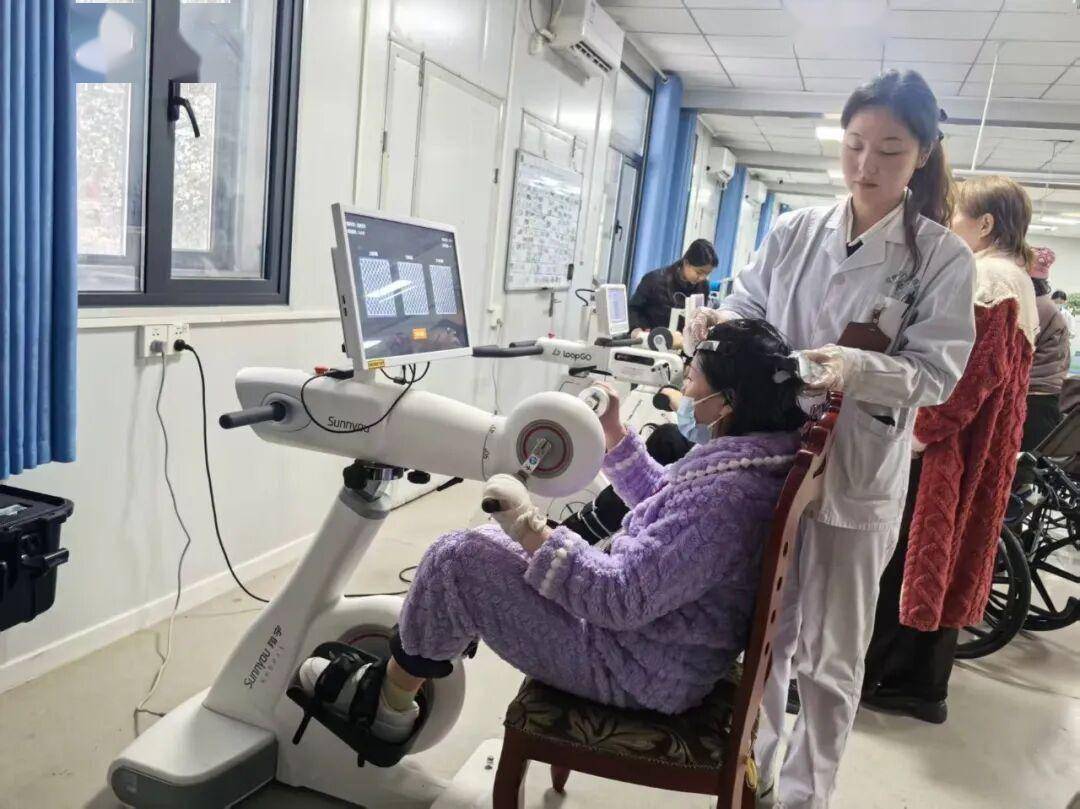 康复科主任郭宗超带领团队为王阿姨进行了全面评估,结合其病情制定了脑机接口下肢外骨骼康复方案。训练初期,医护人员为王阿姨戴上轻量化脑电设备,柔性电极紧贴头皮,精准捕捉大脑运动皮层的微弱信号。“您现在集中注意力,想象自己抬起左腿、向前迈步。”在治疗师的引导下,王阿姨凝神聚力,大脑发出的“迈步”意图被设备毫秒级解码,驱动外骨骼机器人带动其瘫痪的左腿,完成了符合生物力学的抬升、迈步、落地动作。屏幕上实时跳动的脑电波形与动作轨迹,让她清晰看到自己的意念正在转化为实际行动。