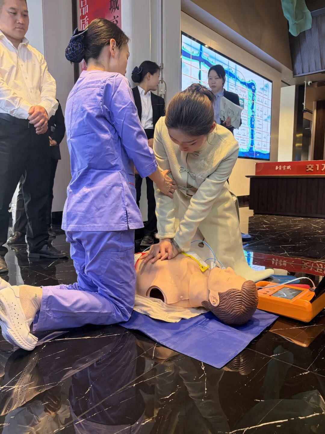 实操演练环节,王晓峰护士长借助专业急救模拟人,进行标准化示范。随后,物业工作人员分组上手实操,王护士长全程一对一耐心指导,逐一纠正按压姿势、力度、频率等不规范动作,确保每位参训人员都能熟练掌握核心要领,真正做到“会判断、会操作、救得准”。