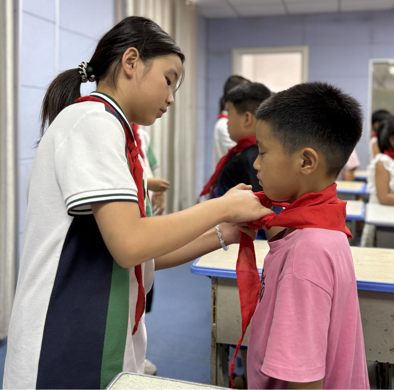 在热烈的掌声中,老队员们面带微笑,郑重地为新队员系上红领巾。红色的领巾在新队员颈间飘扬,这是荣誉的象征,更是责任的嘱托。每一个系红领巾的动作都格外认真,老队员们将“新时代好少年”的期许融入其中,新队员们则以挺直的身板回应这份期许——从戴上红领巾的这一刻起,他们便知晓自己要以更严格的标准要求自己,在学习和生活中践行“强国复兴有我”的信念,让红领巾因自己的努力而更加鲜艳。