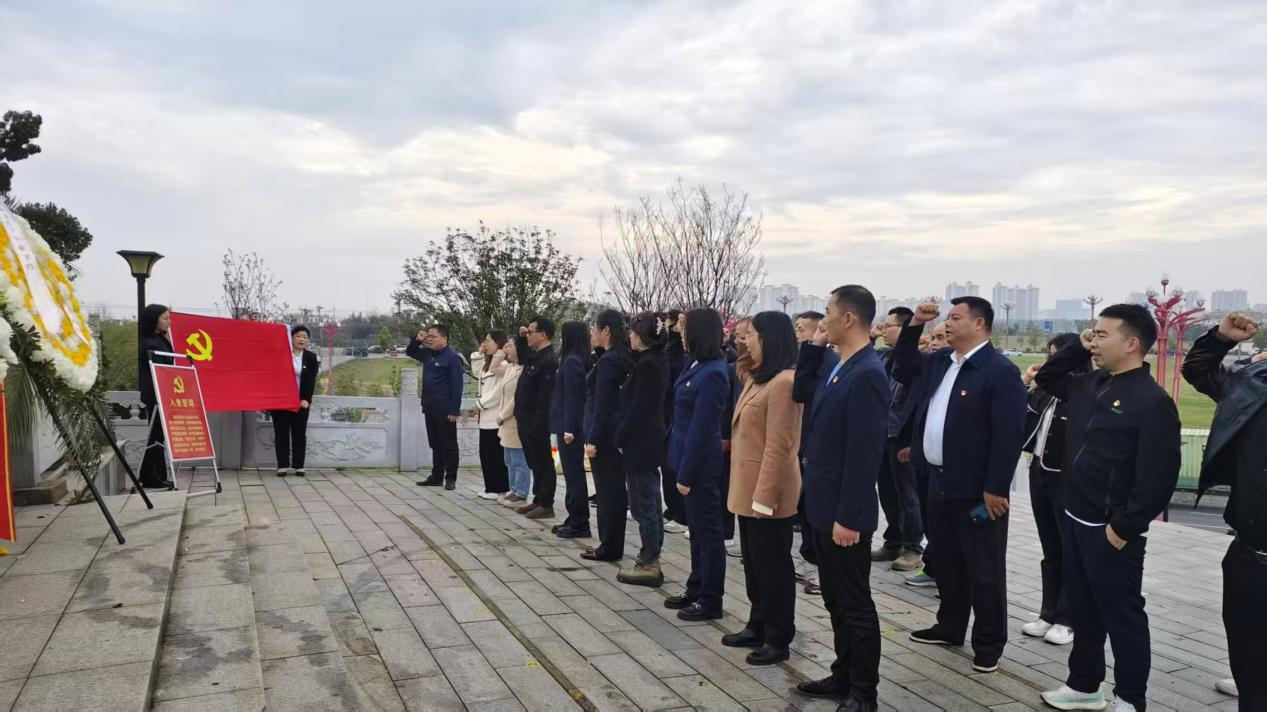 在鲜红的党旗下,全体党员高举右拳,庄严宣誓,铿锵有力的誓言回荡在纪念塔上空,彰显出新时代党员不忘初心、牢记使命的坚定信念。大家依次缓步绕行纪念塔,手持素雅菊花敬献于纪念碑前,认真瞻仰碑身镌刻的英烈事迹,感悟革命先烈坚定信仰、无畏牺牲的伟大精神。