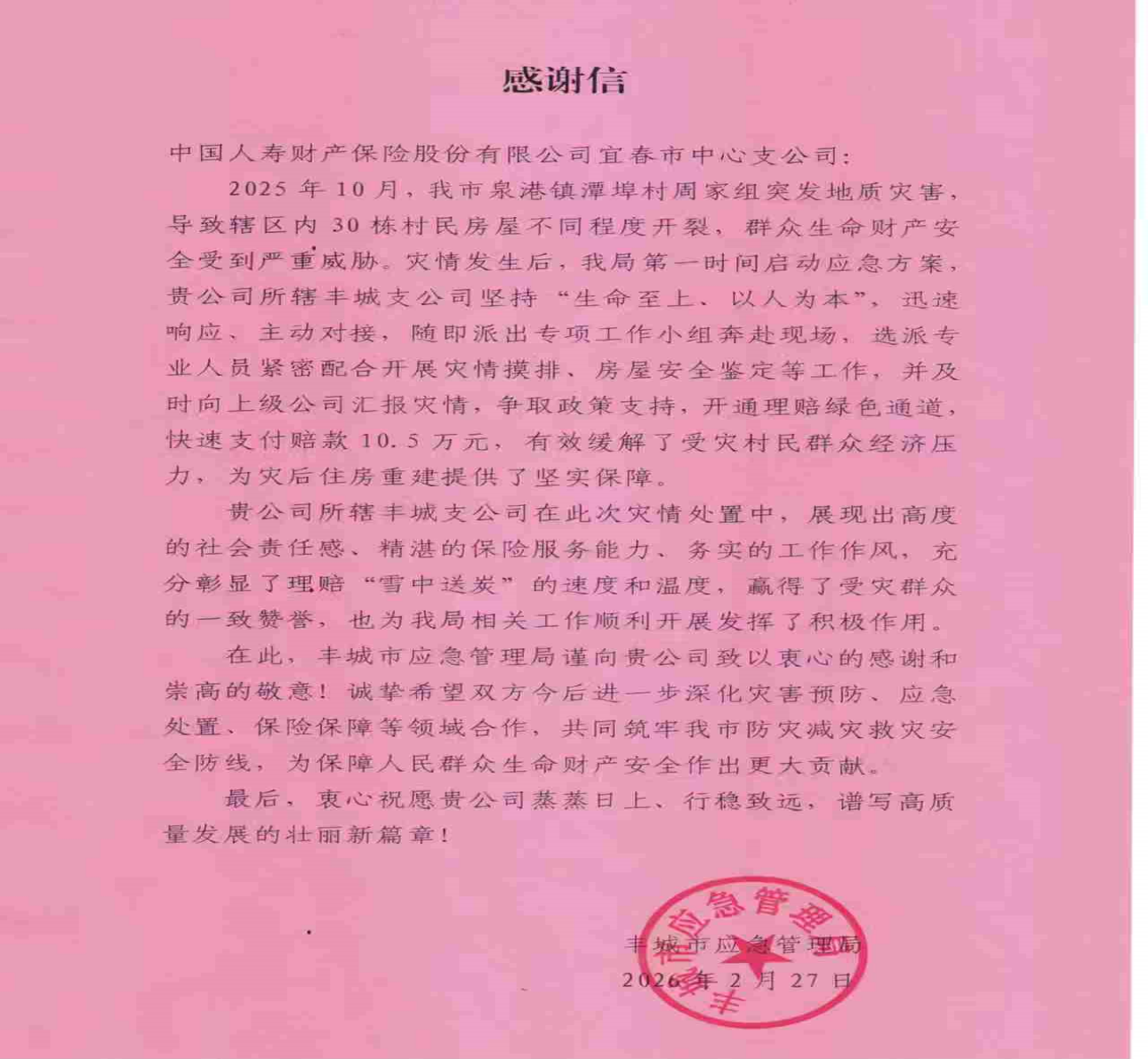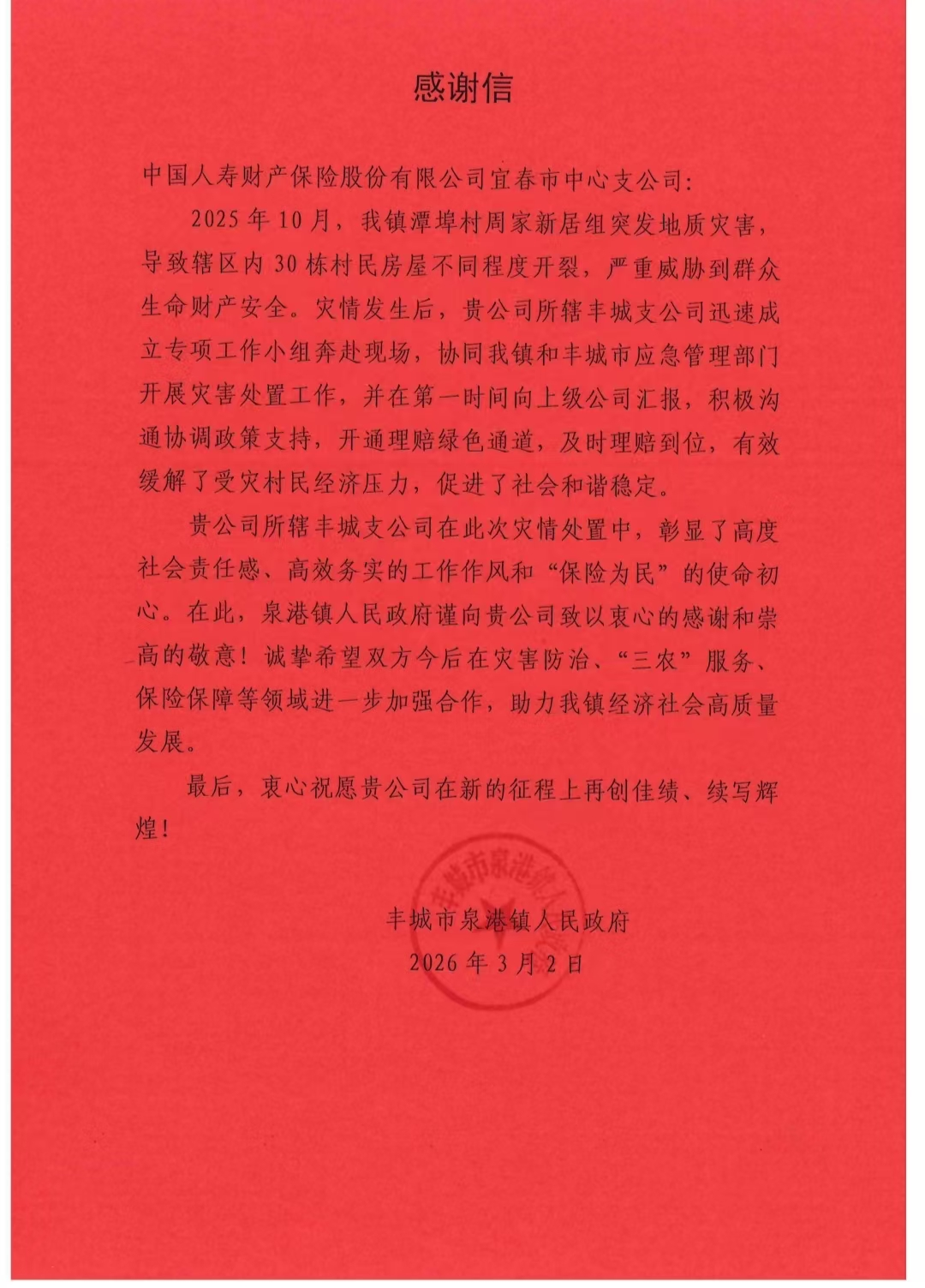 2026年3月3日,中国人寿财险宜春市中心支公司收到丰城市应急管理局与丰城市泉港镇人民政府发来的两封感谢信。信中对该公司在农村受灾房屋理赔过程中展现出的高度负责的担当精神、高效务实的工作作风,给予充分肯定与诚挚感谢。
